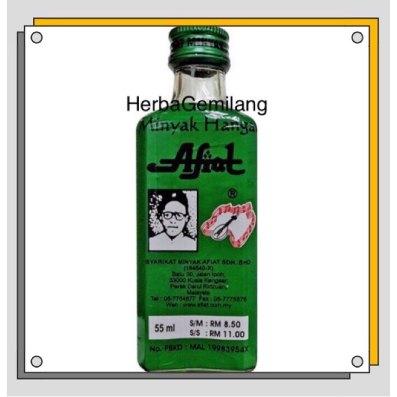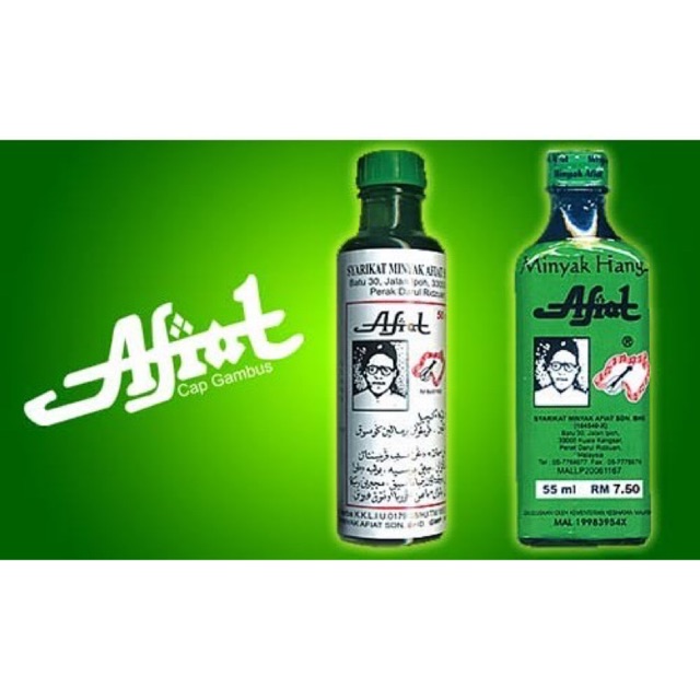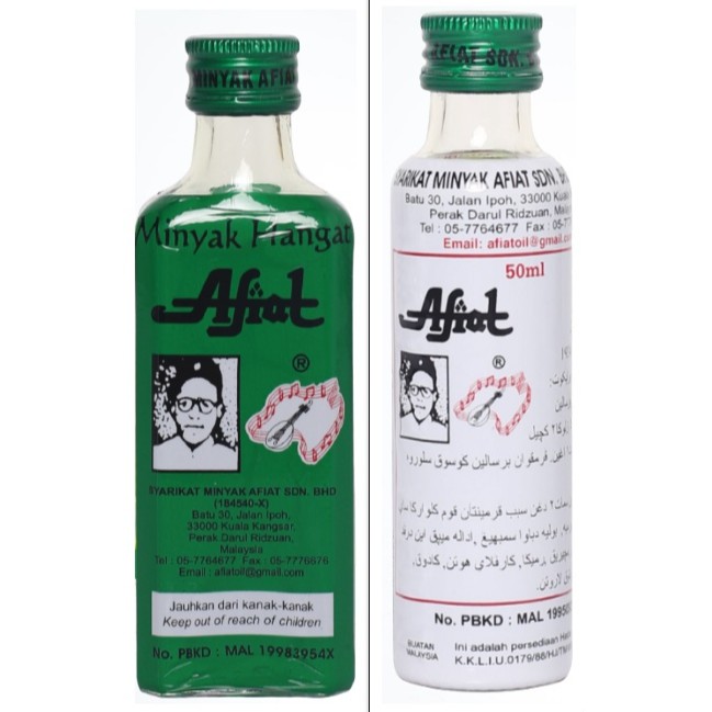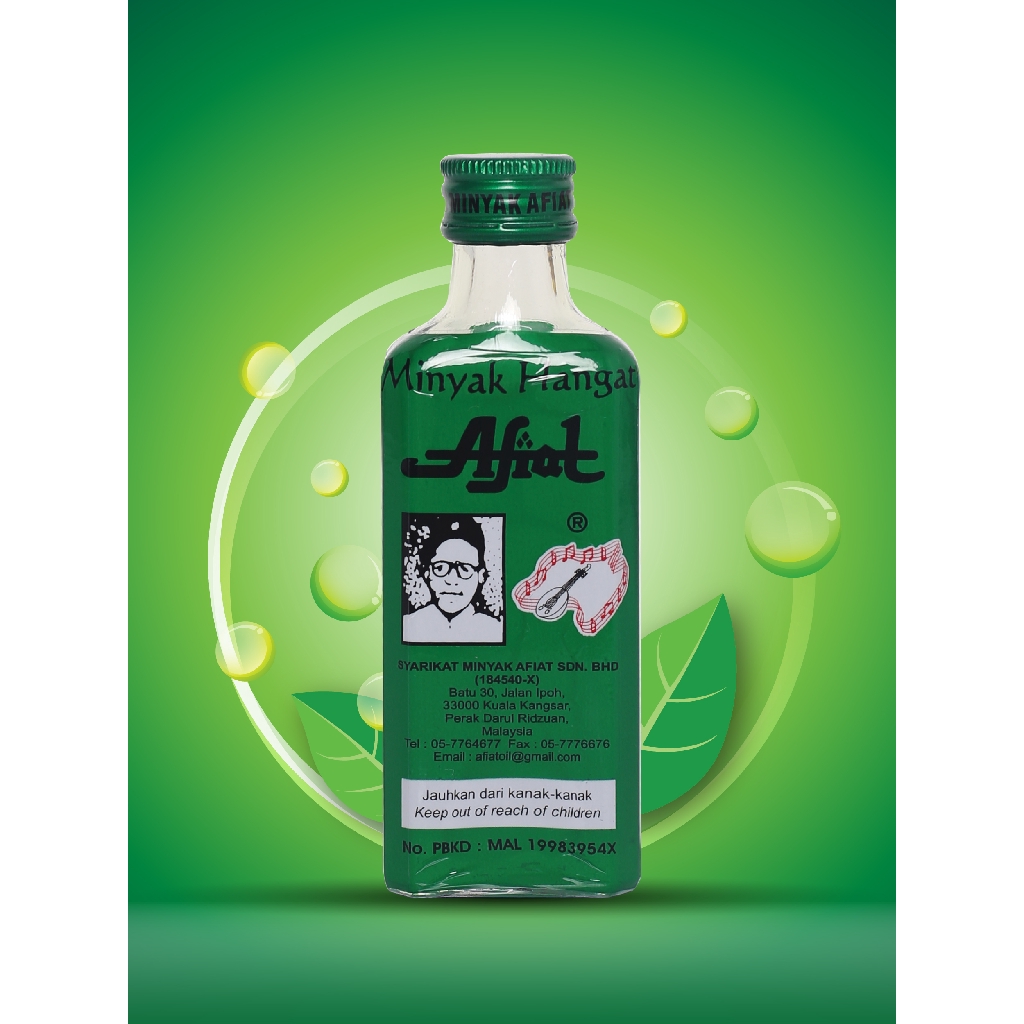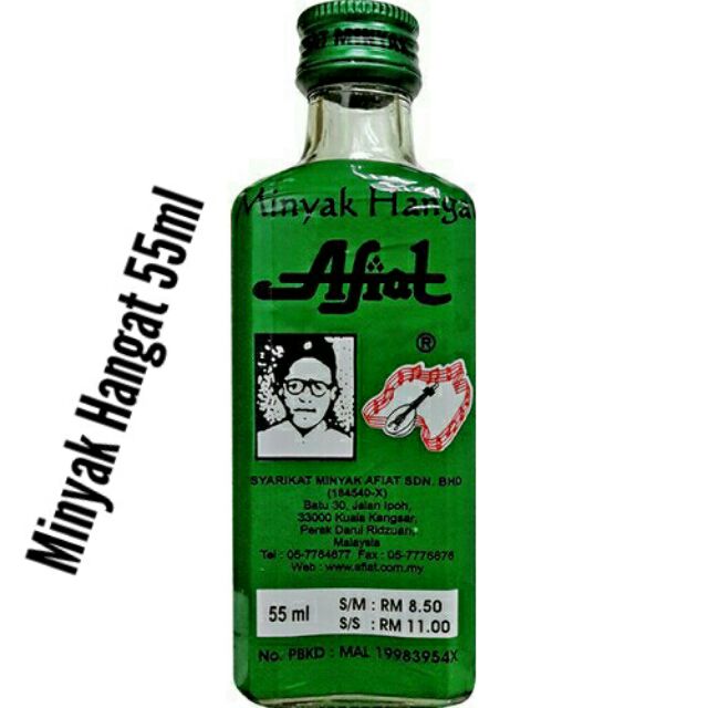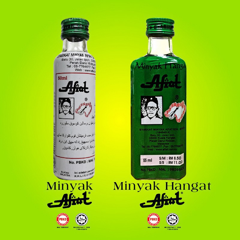 Minyak Afiat dirumus secara tradisional menggunakan herba seperti kayu putih serai wangi kelapa dan daun pudina yang terbukti kebersenannya untuk melegakan sengal-sengal sendi dan otot pening kepala angin dalam badan serta masalah pernafasan. Teman takde menggunakan minyak ni untuk sapu perut sebelum berbarut sebab. Minyak hangat afiat hijau RM1000.